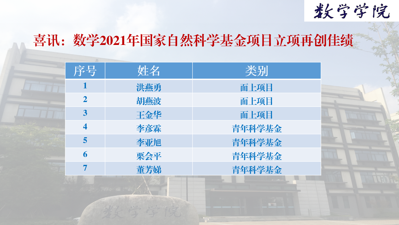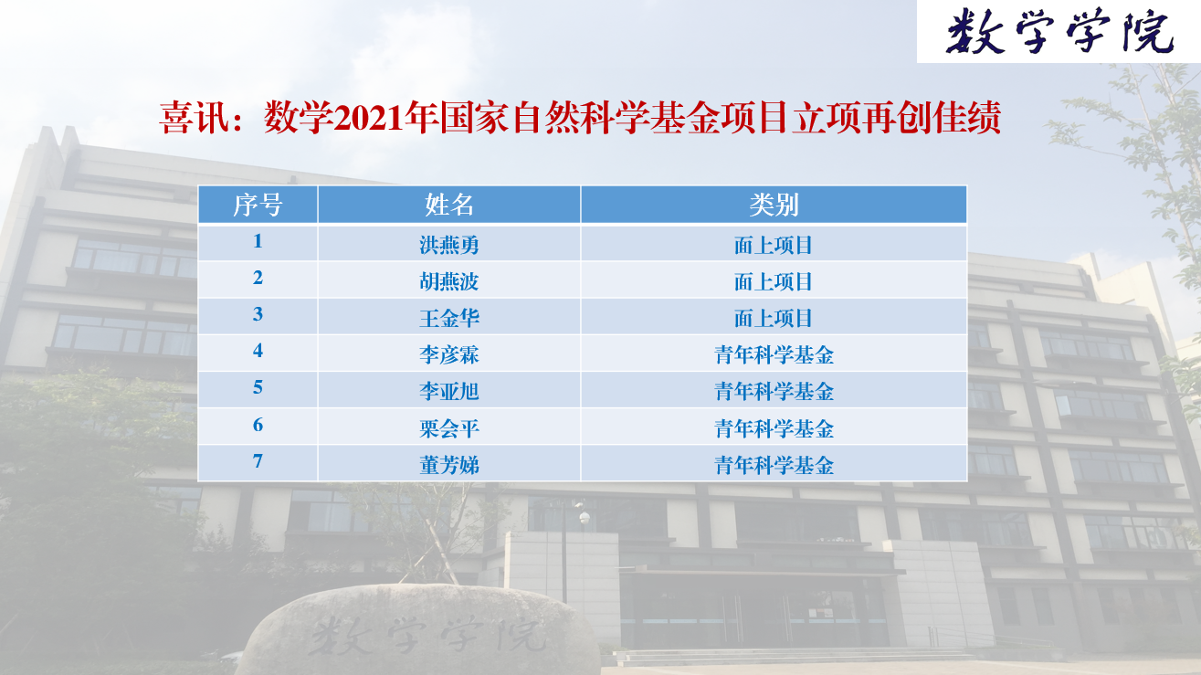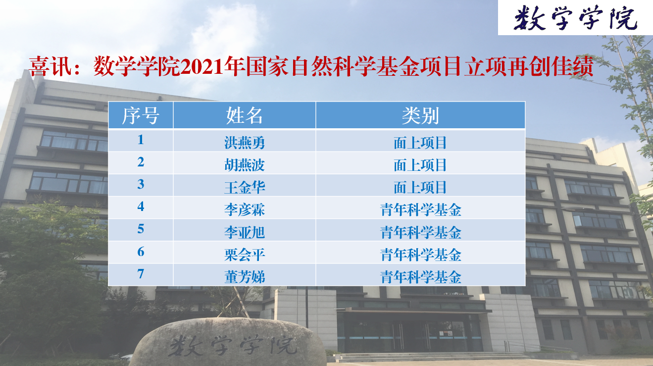日前,国家自然科学基金委员会(NSFC)公布了2021年国家自然科学基金评审结果。69成人小说 今年国家自然科学基金项目申报取得佳绩,共有7个项目获立项资助,其中面上项目3项,青年科学基金项目4项。
