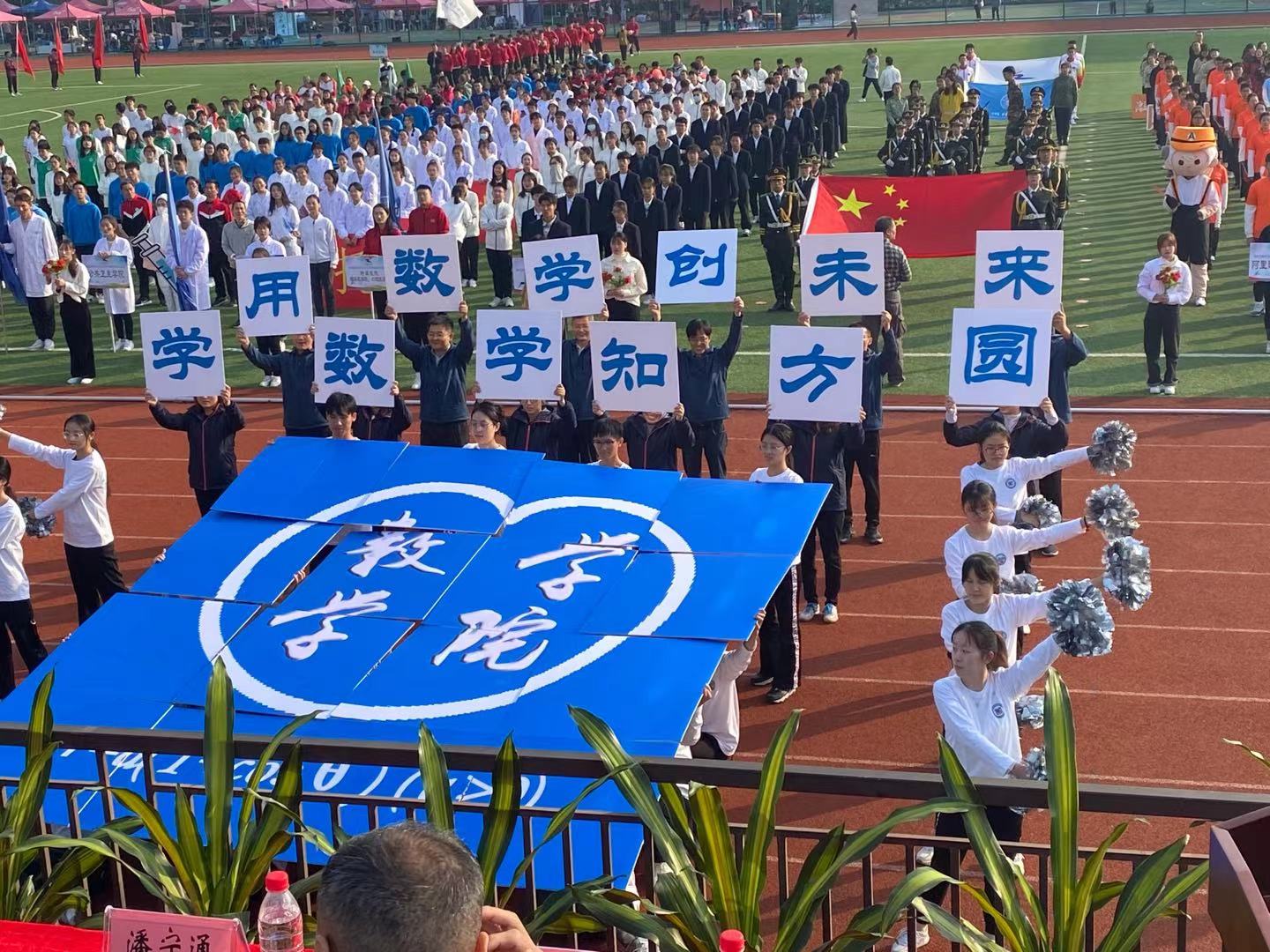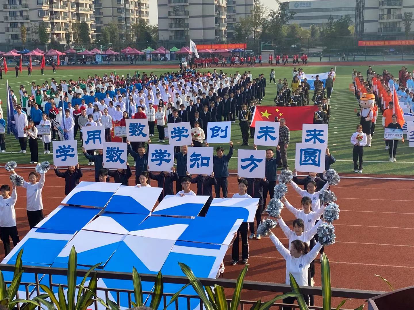 现场展示的大写英文字母“M”,是数学学科的国际缩写,方阵中心的巨型LOGO是数学学科的无穷大符号,体现了数学人“星辰大海”的远大梦想。由r=a(1+cosθ)函数构成的巨幅心形,用充满特色的数字语言表达了数学的美妙和浪漫。方阵队员齐声高呼“学数学、知方圆,用数学、创未来”,展现了数学人“建强基础学科、争创一流大学、实现民族伟大复兴”的爱国荣校情怀。