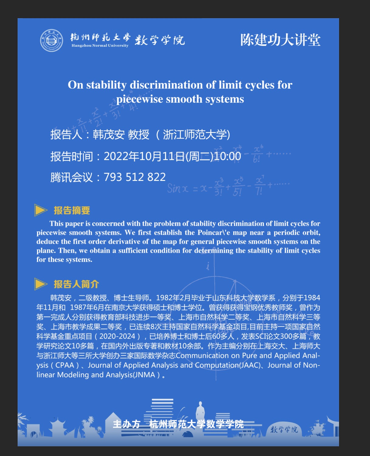 陈建功大讲堂:On stability discrimination of limit cycles for piecewise smooth systems