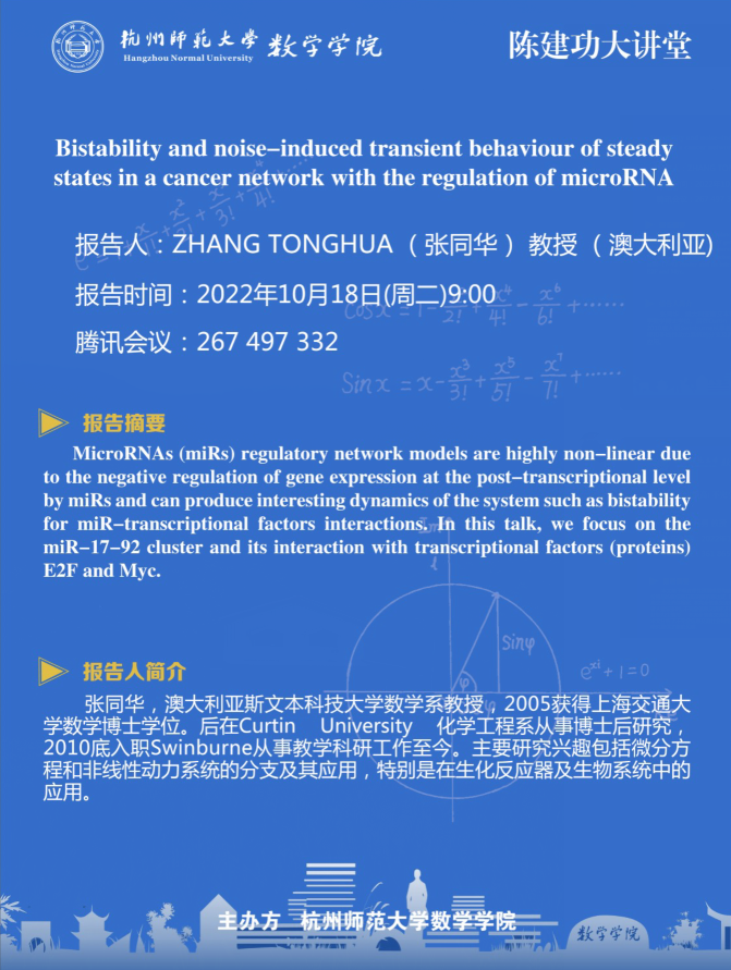 陈建功大讲堂:Bistability and noise-induced transient behaviour of steady states in a cancer network with the regulation of microRNA