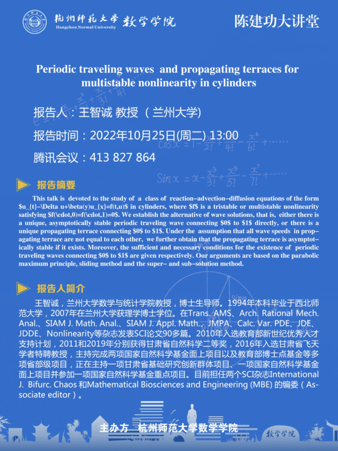 陈建功大讲堂:Periodic traveling waves and propagating terraces for multistable nonlinearity in cylinders