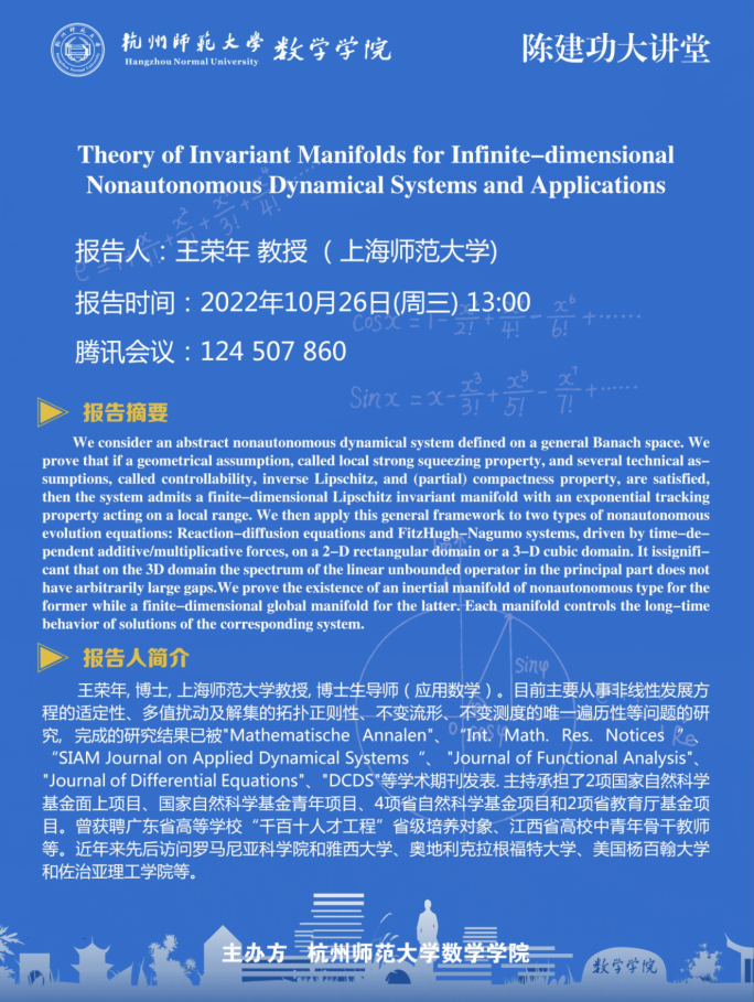 陈建功大讲堂:Theory of Invariant Manifolds for Infinite-dimensional Nonautonomous Dynamical Systems and Applications