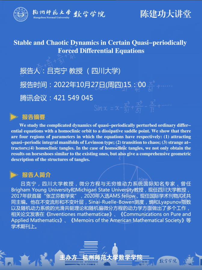 陈建功大讲堂:Stable and Chaotic Dynamics in Certain Quasi-periodically Forced Differential Equations
