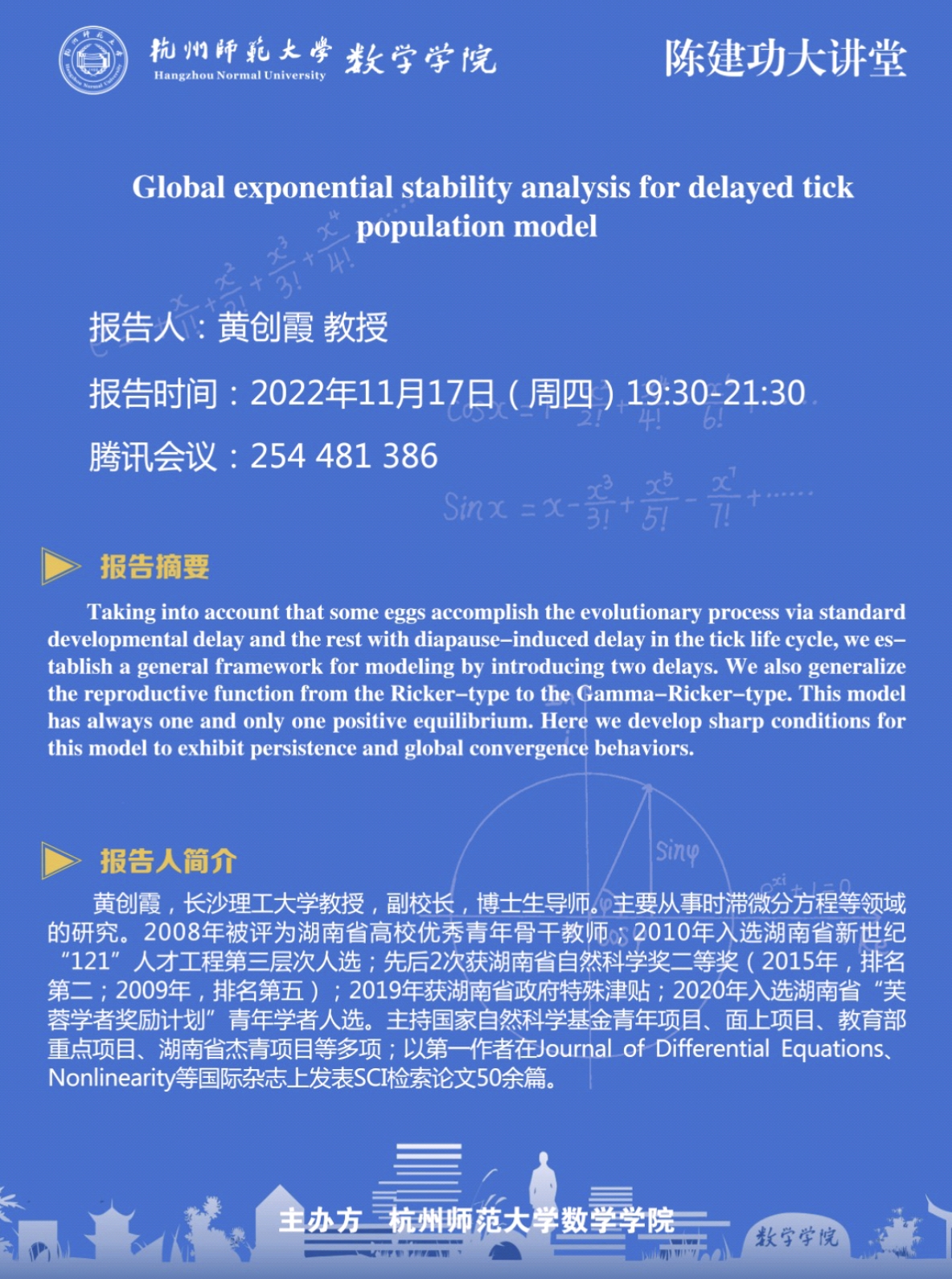 陈建功大讲堂:Global exponential stability analysis for delayed tick population