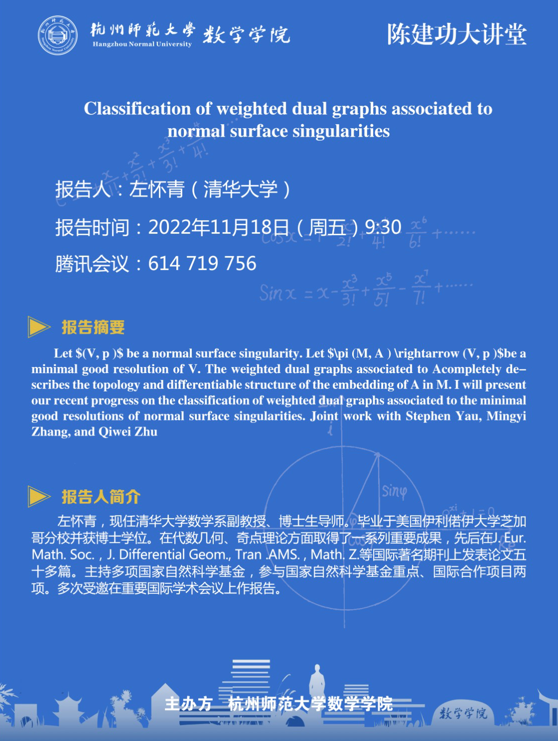 陈建功大讲堂:Classification of weighted dual graphs associated to normal surface singularities