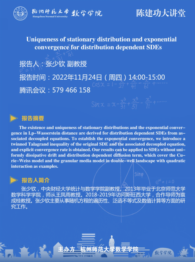 陈建功大讲堂:Uniqueness of stationary distribution and exponential convergence for distribution dependent SDEs