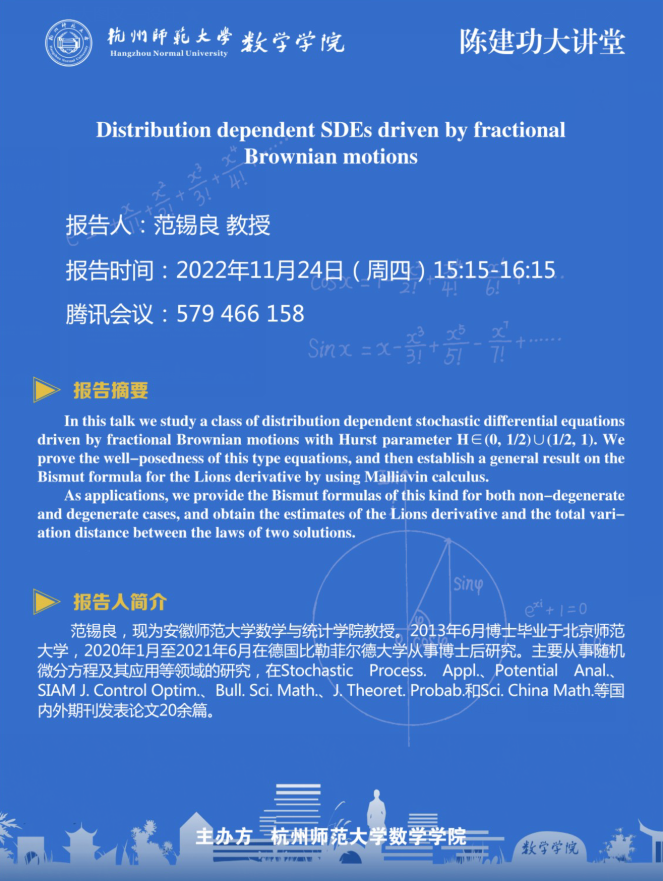 陈建功大讲堂:Distribution dependent SDEs driven by fractional Brownian motions