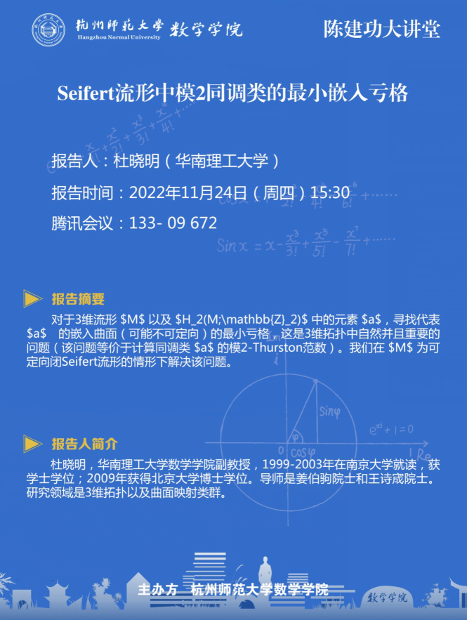 陈建功大讲堂:Seifert流形中模2同调类的最小嵌入亏格