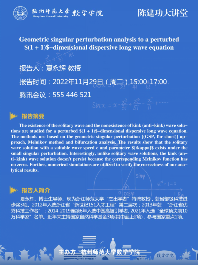 陈建功大讲堂:Geometric singular perturbation analysis to a perturbed $(1 + 1)$-dimensional dispersive long wave equation