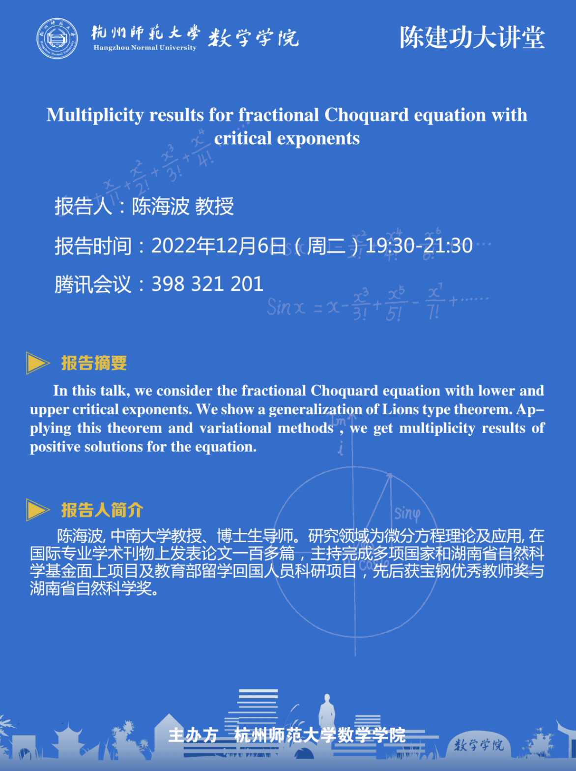 陈建功大讲堂:Multiplicity results for fractional Choquard equation with critical exponents