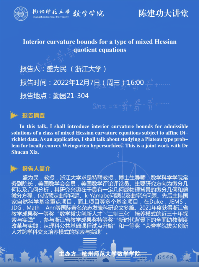 陈建功大讲堂:Interior curvature bounds for a type of mixed Hessian quotient equations