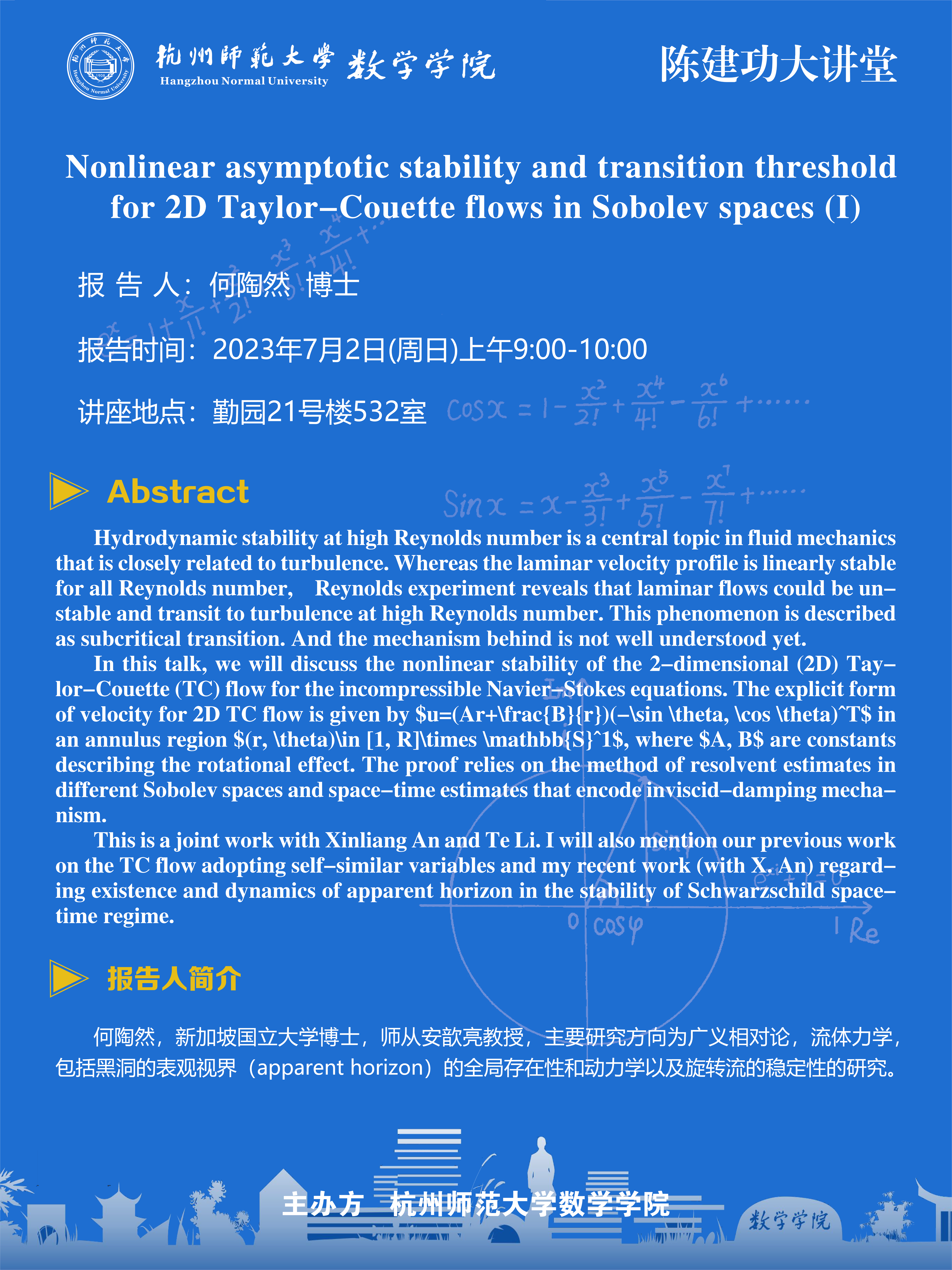 陈建功大讲堂:Nonlinear asymptotic stability and transition threshold for 2D Taylor-Couette flows in Sobolev spaces (I)