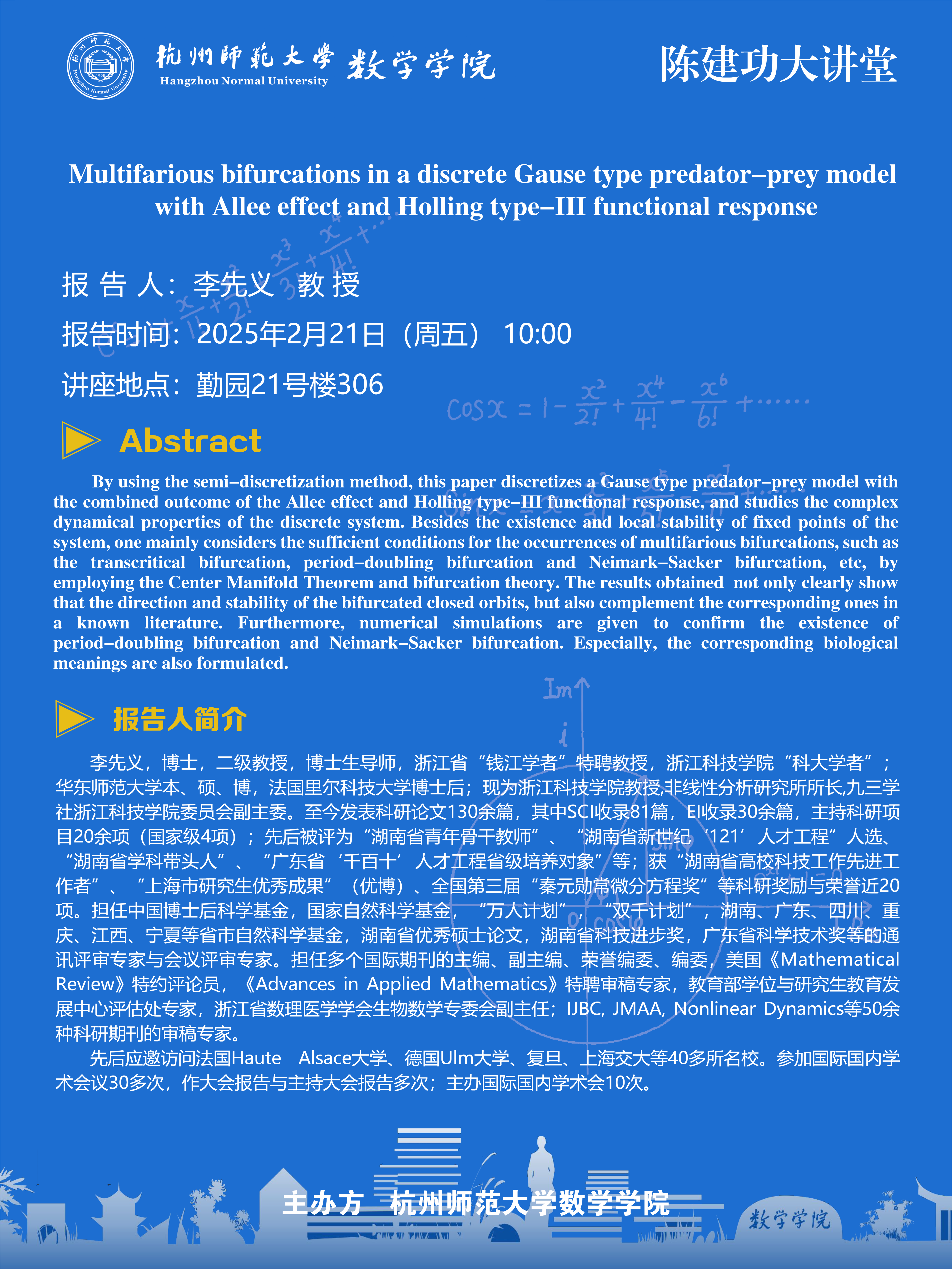 陈建功大讲堂(2025-5):Multifarious bifurcations in a discrete Gause type predator-prey model with Allee effect and Holling type-III functional response