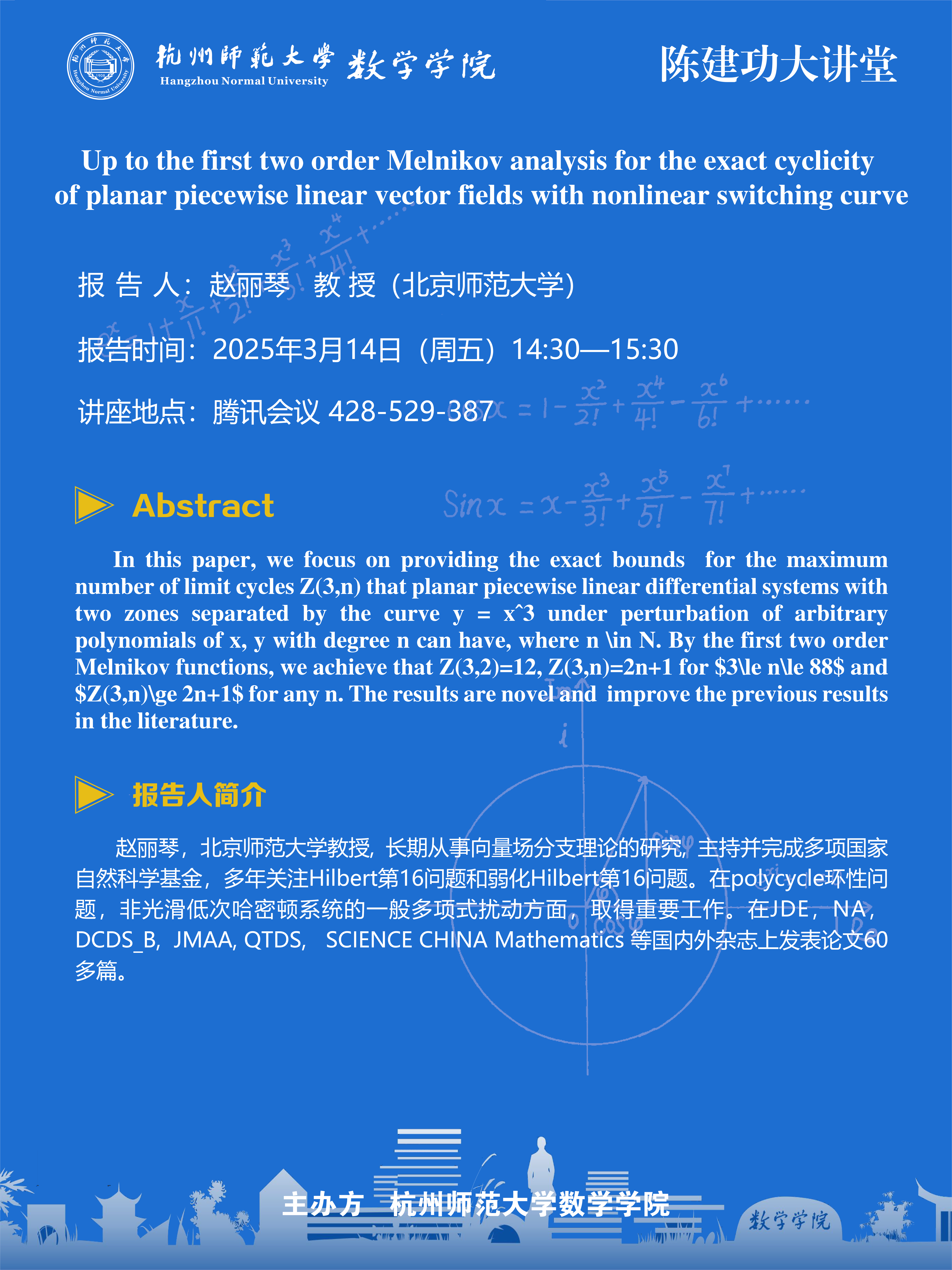 陈建功大讲堂(2025-15):Up to the first two order Melnikov analysis for the exact cyclicity of planar piecewise linear vector fields with nonlinear switching curve